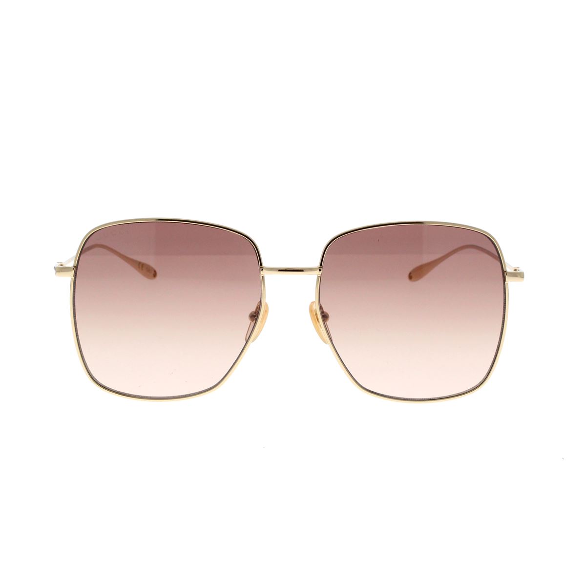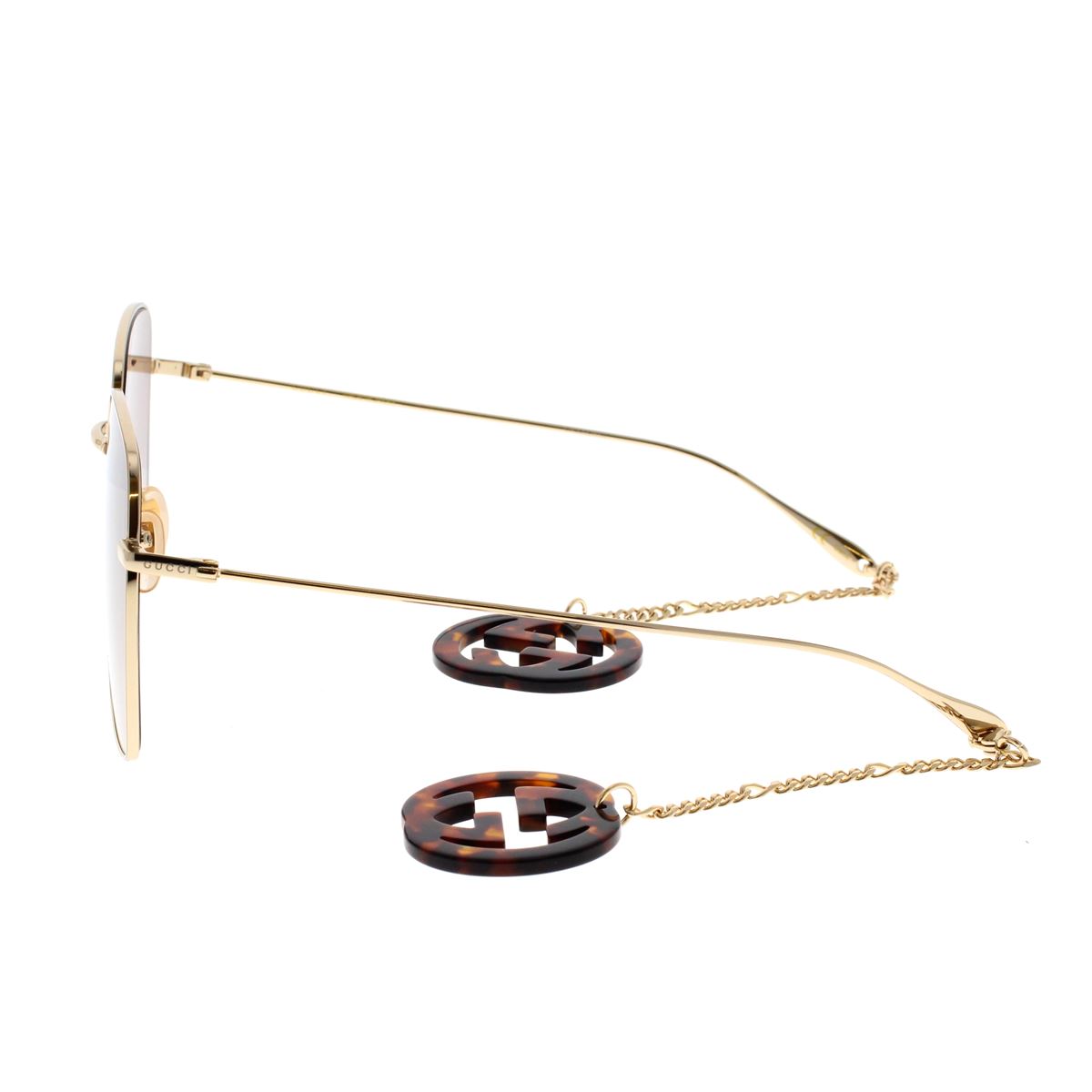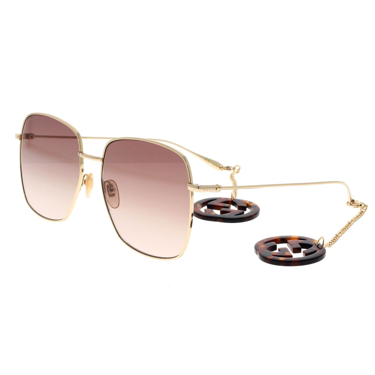 Transparenzen, Farbschattierungen und Anhänger in Tierform verleihen dieser leichten und ungreifbaren Goldfassung einen traumhaften Touch. Das übergroße, quadratische Modell zeichnet sich durch exklusive Gucci-Anhänger aus: mit GG-Logo, in Herzform und in einer neuen, auffälligen Version in Form eines Waschbären. Das Gucci-Logo ist per Lasergravur in die Bügel aus Leichtmetall eingraviert. Die Fassung in ultrafemininen Goldtönen wird mit Verlaufsgläsern und eklektischen Details wie den rosafarbenen Strasssteinen, die die Augen des Waschbären schmücken, kombiniert.