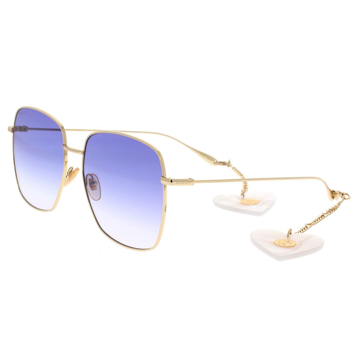Transparenzen, Farbschattierungen und Anhänger in Tierform verleihen dieser leichten und ungreifbaren Goldfassung einen traumhaften Touch. Das übergroße, quadratische Modell zeichnet sich durch exklusive Gucci-Anhänger aus: mit GG-Logo, in Herzform und in einer neuen, auffälligen Version in Form eines Waschbären. Das Gucci-Logo ist per Lasergravur in die Bügel aus Leichtmetall eingraviert. Das Gestell in ultrafemininen Goldtönen ist mit Verlaufsgläsern und eklektischen Details wie den rosafarbenen Strasssteinen , die die Augen des Waschbären schmücken, kombiniert.