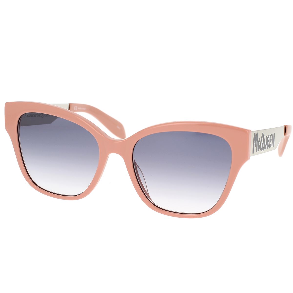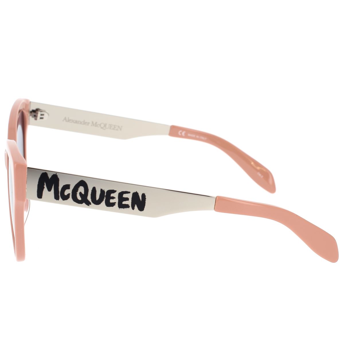 McQueen Graffiti ist eine jugendliche und frische Interpretation der Handschrift von Alexander McQueen, die für SS22 in einer deklinierten Form neu vorgestellt wird. Katzenaugenform, feminin, aus Acetat, mit dünnen Metallbügeln. Das McQueen-Logo ist auf den Bügeln aufgedruckt.