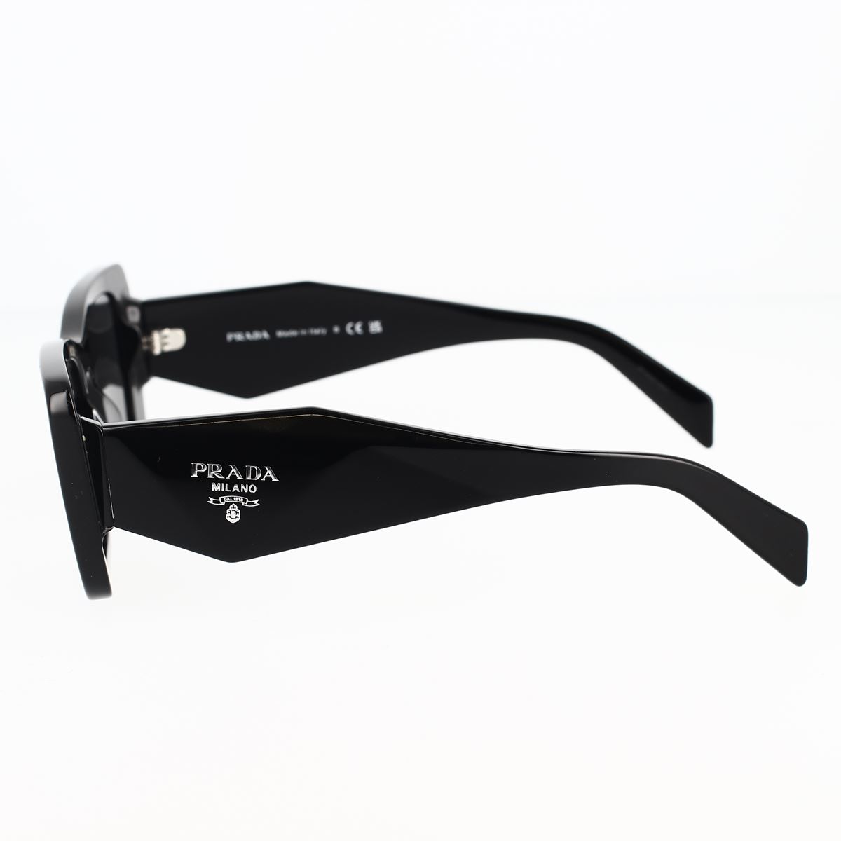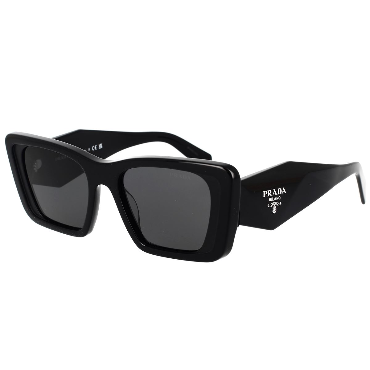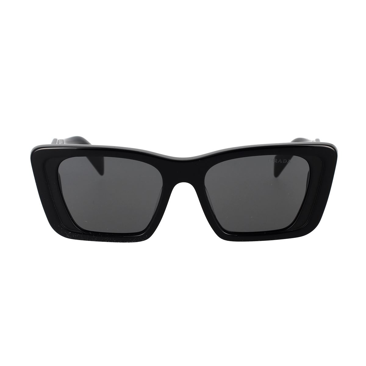 Acetat-Sonnenbrille aus der Kollektion Prada Symbole. Der rechteckige Rahmen betont die avantgardistischen Konturen der Vorderseite dank einer einzigartigen Kombination von Acetatschichten. Die dreidimensionale Verarbeitung der Bügel wird mit einer ikonografischen Interpretation des traditionellen Prada-Dreieckslogos versiegelt.